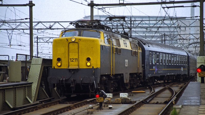 De NS 1211 komt met een internationale trein Amsterdam Centraal binnen gereden. 28 maart 1998. © René Rathmann |