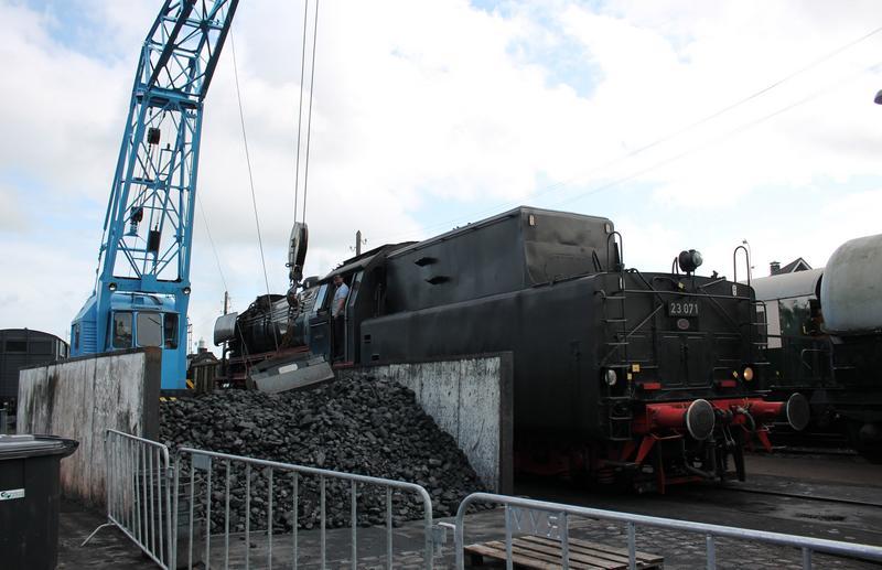 Dieselkraan 1015 is bezig met het bevoorraden van de 65 018 van de Stoom Stichting Nederland. |
