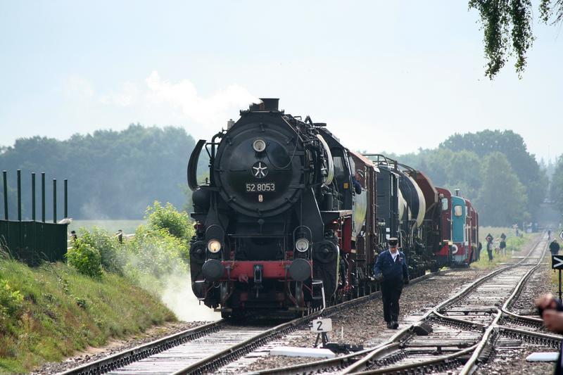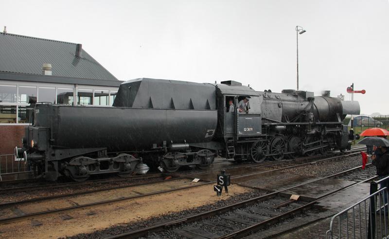 VSM Stoomloc 52 3879 uit 1944 trok 's morgens vroeg de eerste goederentrein met de 52 8053 en de 52 8139 achterop. |