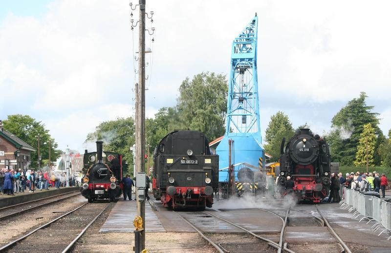 Drie stoomlocomotieven die niet vaak samen op één foto te zien zullen zijn. Van links naar rechts: VSM 64 415, SGB Loc 3 en de SHM 7742 (Bello). |