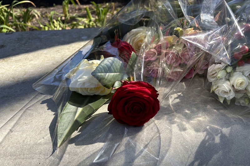 Vandaag leggen na de minuut stilte familieleden, hulpverleners en wijkbewoners bloemen op een van de bankjes van het monument. Op dat bankje staan ook vier kaarsen, één voor elk van de slachtoffers van de tramaanslag. Foto's: © RegioNieuwsUtrecht.nl |