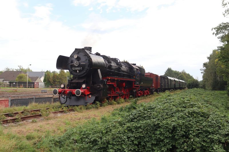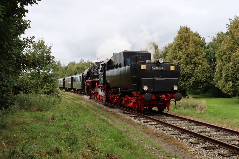 De 52 8060 is zojuist met drie rijtuigen uit Stadskanaal vertrokken naar Nieuw-Buinen. |