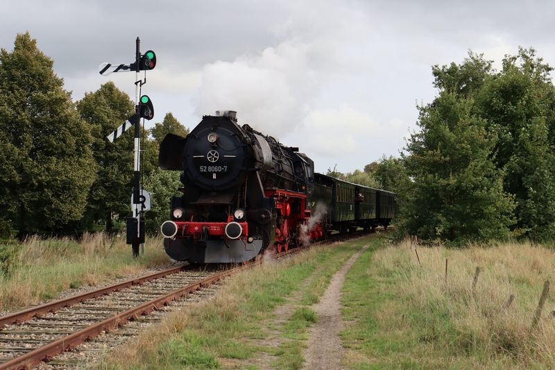 De 52 8060 vertrekt met de drie rijtuigen langs het inrijsein station Stadskanaal binnen. |