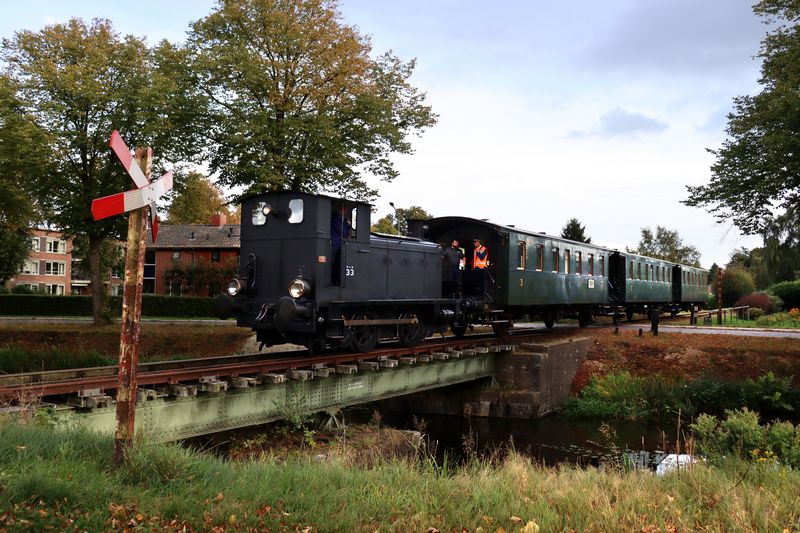 De WD 70033, van Stichting 162, rijdt met drie rijtuigen over een bruggetje ter hoogte van de Drouwenerstraat in Stadskanaal onderweg naar Nieuw-Buinen. |