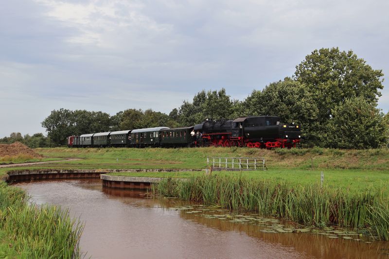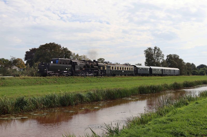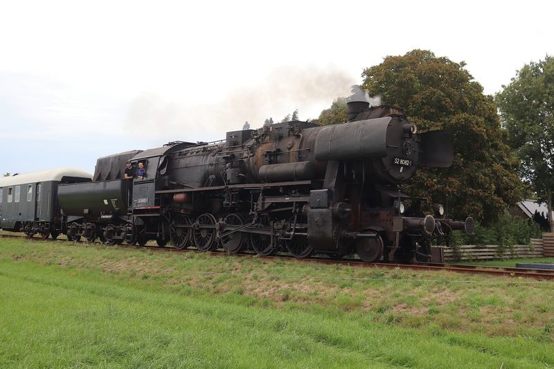 De 52 8082 rijdt met een reizigerstrein, en de Blokkendoos mC 9002 van de Stichting 2454 CREW, vanuit Stadskanaal naar Veendam. Op de foto rijdt de trein tussen Stadskanaal en Pekelderweg, waar een omloopspoor ligt. |