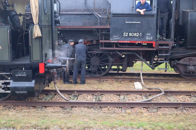 De 52 8082 rangeert naar de Blokkendoos en de andere rijtuigen om richting Veendam te vertrekken. |