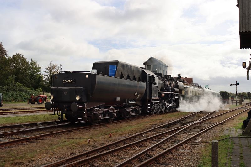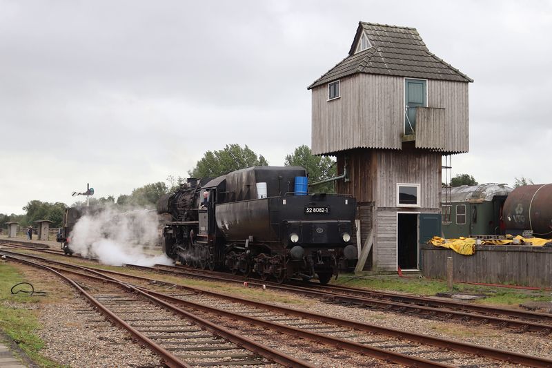 De 52 8082 vertrekt met een reizigerstrein, met de mC 9002 van de Stichting 2454 CREW, uit Stadskanaal naar Veendam. |