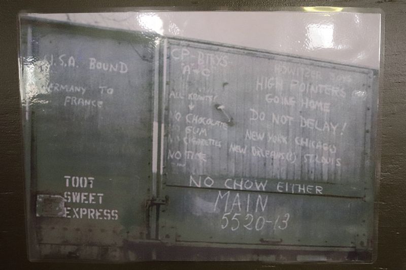 De boxcar USATC 2200055 uit 1944 is door de Stichting 162 prachtig gerestaureerd en was tijdens Stadskanaal onder Stoom te zien. Op de zijkant van de wagon zijn teksten te lezen die de geallieerde soldaten tijdens de Tweede Wereldoorlog op de boxcars schreven. De Stichting 162 heeft alle gekrijte teksten nagemaakt aan de hand van een foto, hier onder te zien, van een boxcar uit die tijd. |