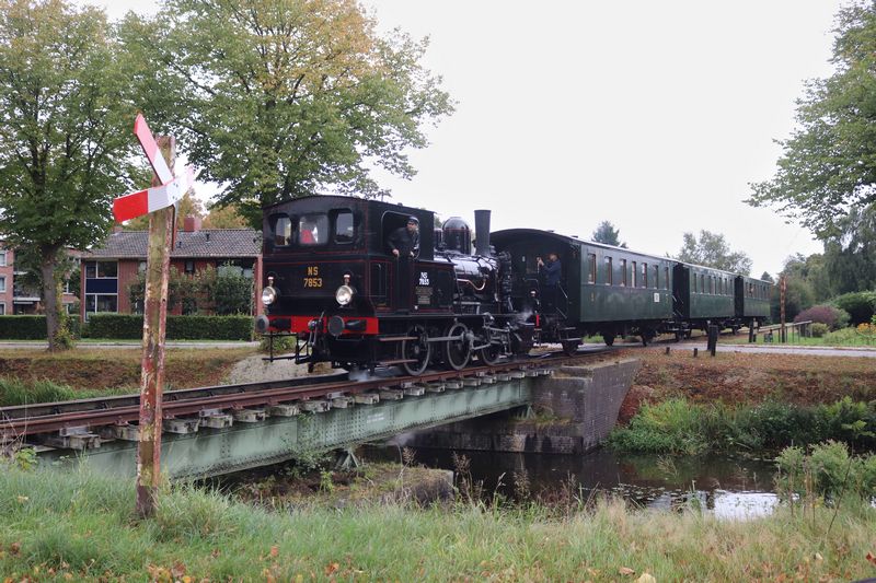 De MBS 7853 rijdt met drie rijtuigen over een bruggetje ter hoogte van de Drouwenerstraat in Stadskanaal onderweg naar Nieuw-Buinen. |