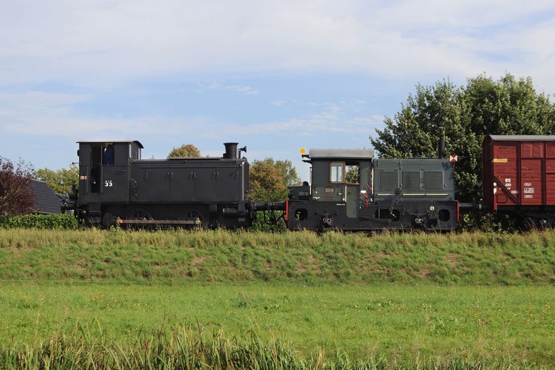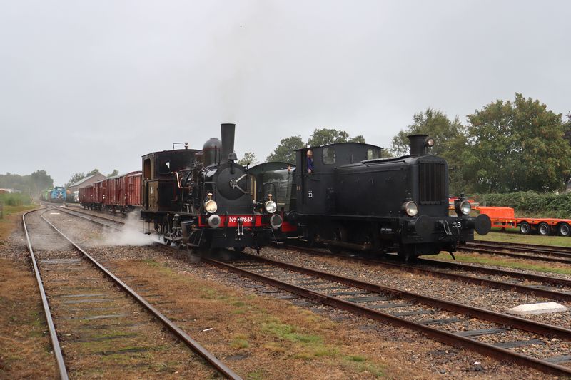 De NS 7853 en de WD 70033, beide locomotieftypes die tijdens de wederopbouw in Nederland reden, naast elkaar in Stadskanaal. De 7853 is een reconstructie van de NS-locomotieven 7851 en 7852, die tussen 1945 en 1948 voor NS in Rotterdam rangeerde. De WD 70033 reed, samen met vier soortgenoten, na de oorlog tot in 1947 in de zwarte War Department-kleur voor de Nederlandsche Tramweg Maatschappij in het noorden van Nederland. Vanaf 1947 reden de vijf locomotieven 10 jaar voor Nederlandsche Spoorwegen. NS schilderde de locomotieven donkergroen en gaf ze nieuwe nummers. De WD 70033 werd de NS 162. |