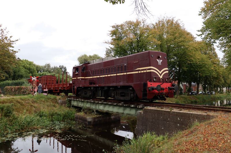 De SMMR 2225 rijdt met een goederentrein over een bruggetje ter hoogte van de Drouwenerstraat in Stadskanaal |