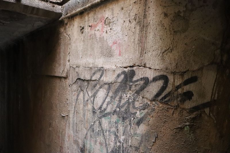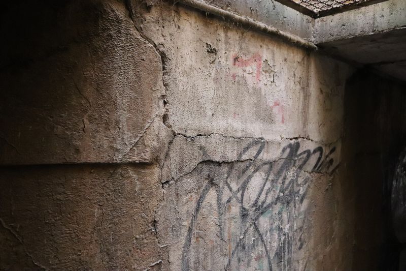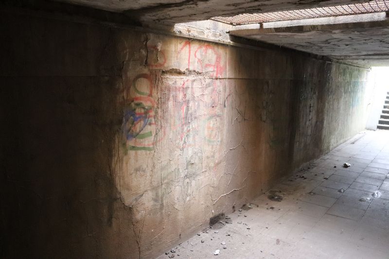 De scheuren in de voetgangerstunnel die onder het spoor doorloopt. |