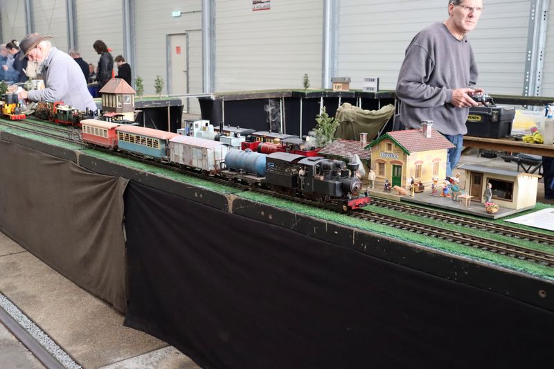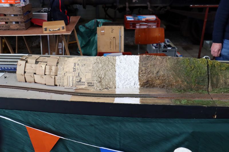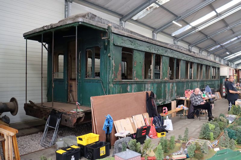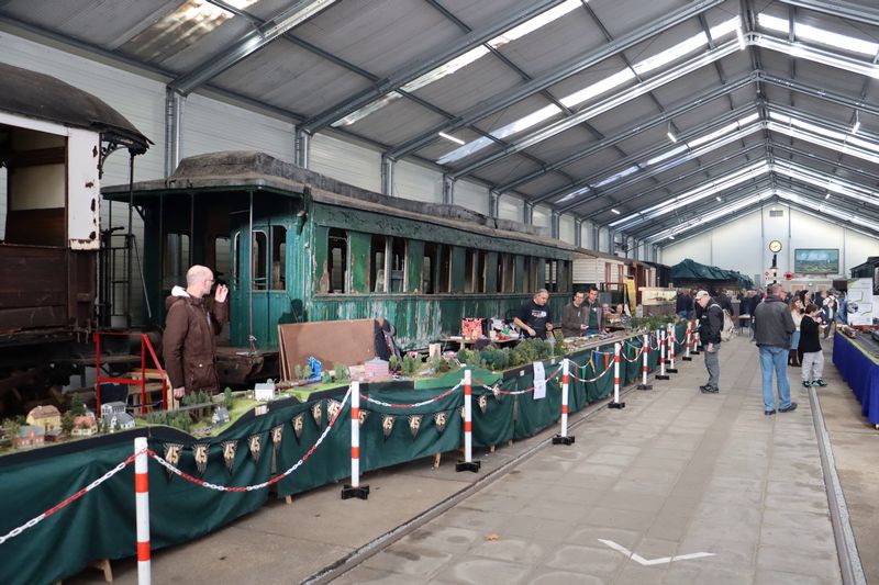 In de loods waren een aantal modelbanen en oude rijtuigen en goederenwagons, die nog op een uitvoerige restauratie wachten, te zien. |