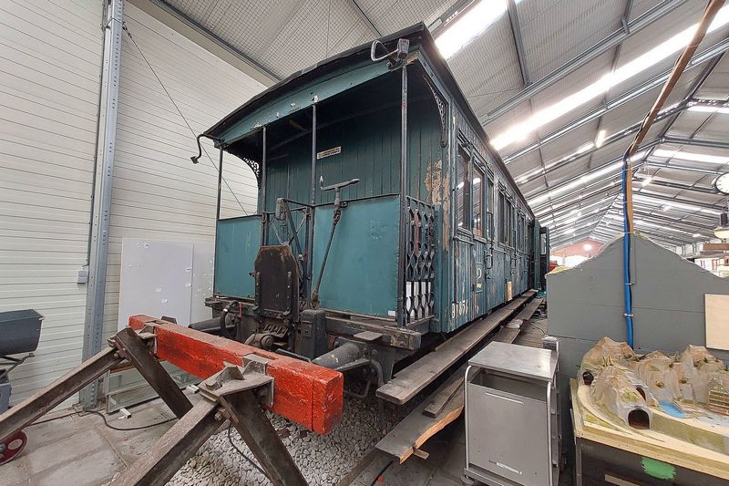 De vrijwilligers van de MBS zijn druk bezig met de restauratie van de NS C1820 uit 1901. |