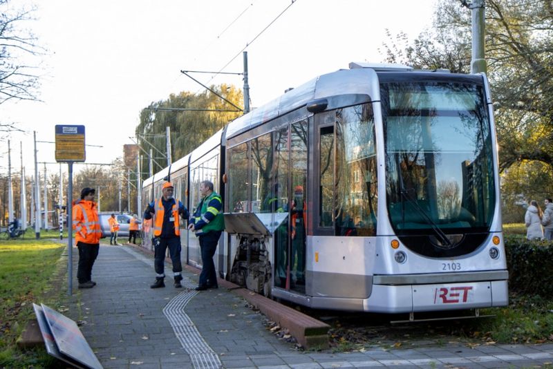 21-11-2025 / 19.55 uur VLAARDINGEN - Vrijdagmiddag 21 november is bij het eindpunt op de Holysingel een tram ontspoord. Een takelbedrijf moest eraan te pas komen om de tram weer op de rails te krijgen. Een oud-medewerker van de RET weet desgevraagd te vertellen dat de bladeren op de rails de meest voor de hand liggende oorzaak zijn. De tram is doorgeschoten bij het eindpunt en uit het spoor gelopen. |