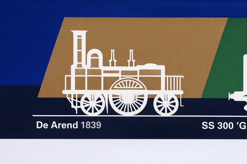 De eerste trein die op de tijdlijn staat afgebeeld, is vanzelfsprekend de locomotief die de eerste stoomtrein in Nederland trok. De Hollandsche IJzeren Spoorweg-Maatschappij (afgekort HIJSM, na 1860 HSM) werd in 1837 als eerste spoorwegmaatschappij in Nederland opgericht. In 1829 wonnen Robert Stephenson and Company de Rainhill Trials in Engeland waarmee stoomtreinen zich aan de hele wereld hadden bewezen. De HIJSM bestelde vier stoomlocomotieven bij R.B. Longridge & Co. In mei 1839 kwam de Snelheid in delen als eerste stoomlocomotief in Nederland aan. De Arend werd als tweede stoomlocomotief van Nederland begin september 1839 geleverd. Op 20 september 1839 werd de spoorlijn tussen Amsterdam en Haarlem als eerste spoorlijn in Nederland feestelijk geopend. De eerste trein, bestaande uit negen rijtuigen, werd getrokken door de Snelheid en de Arend. De Arend werd in 1857 als laatste van de originele vier locomotieven gesloopt. In 1938 werd in opdracht van NS een replica van de Arend gebouwd. Deze replica is in het Spoorwegmuseum te zien. |