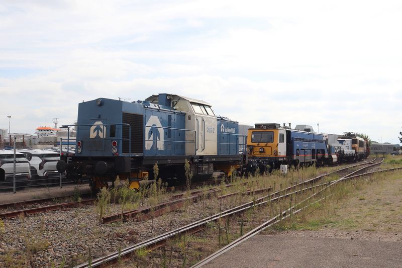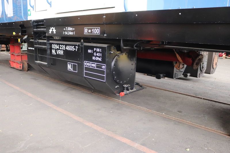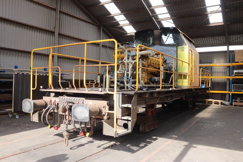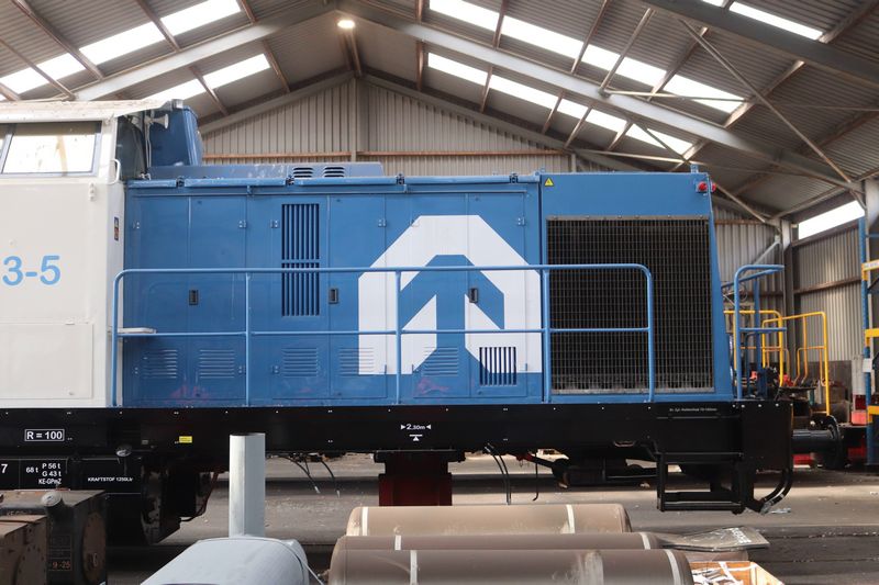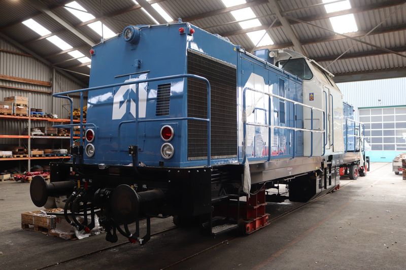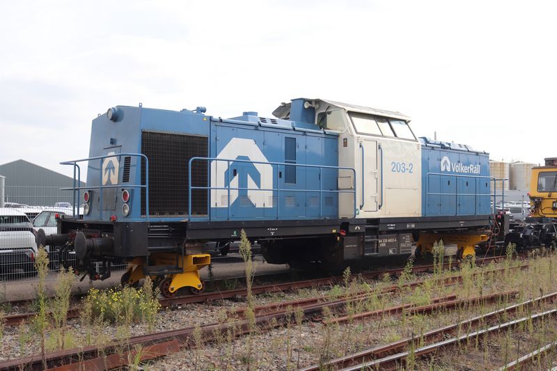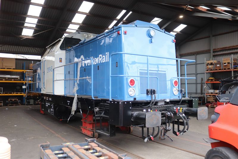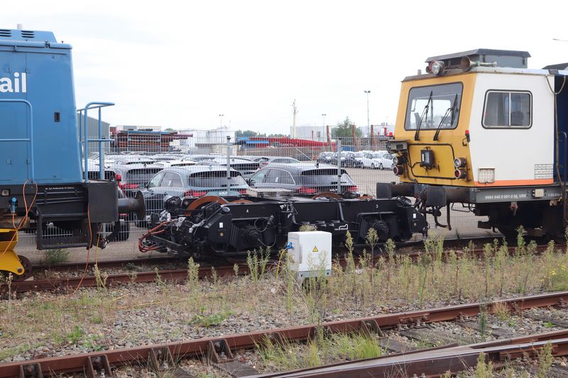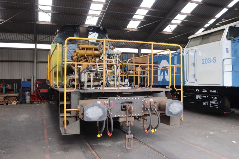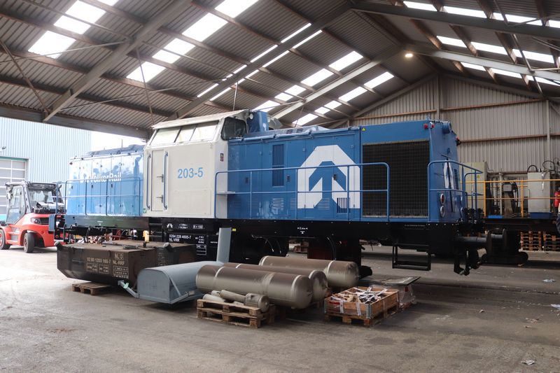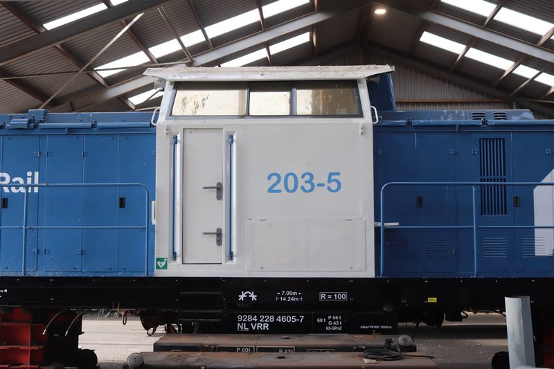 VolkerRail loc 203-5 staat op tijdelijke wieltjes te wachten op de terugkomst van zijn eigen draaistellen.