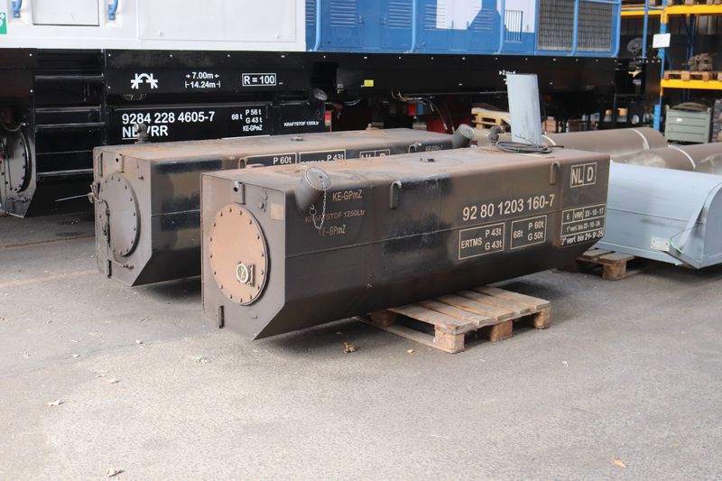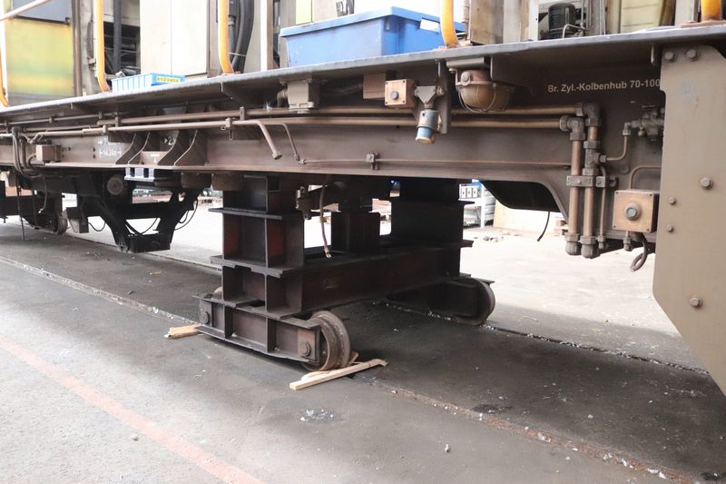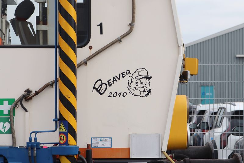 De onderstellen van stopmachine de Beaver waarmee men over het treinspoor rijdt.
