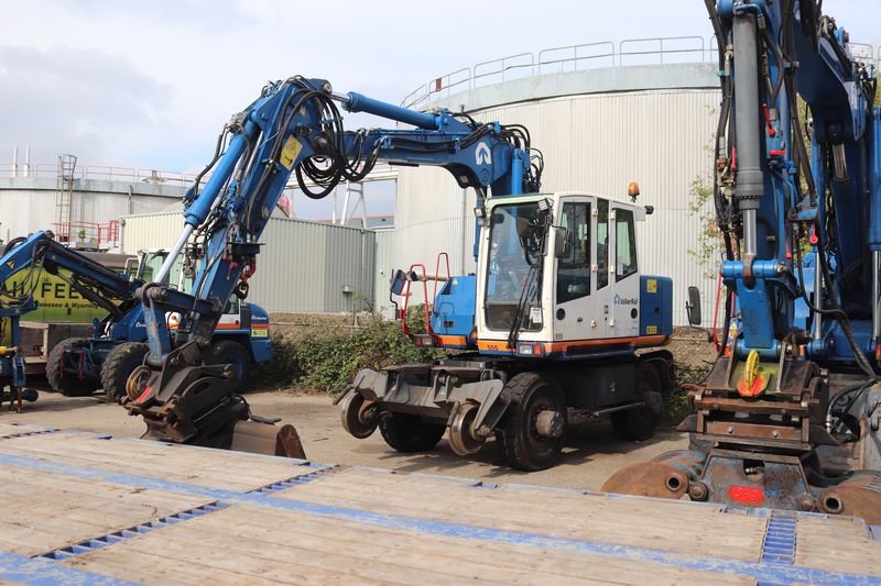 Een rangeervoertuig dat zowel op als naast het spoor kan rijden.