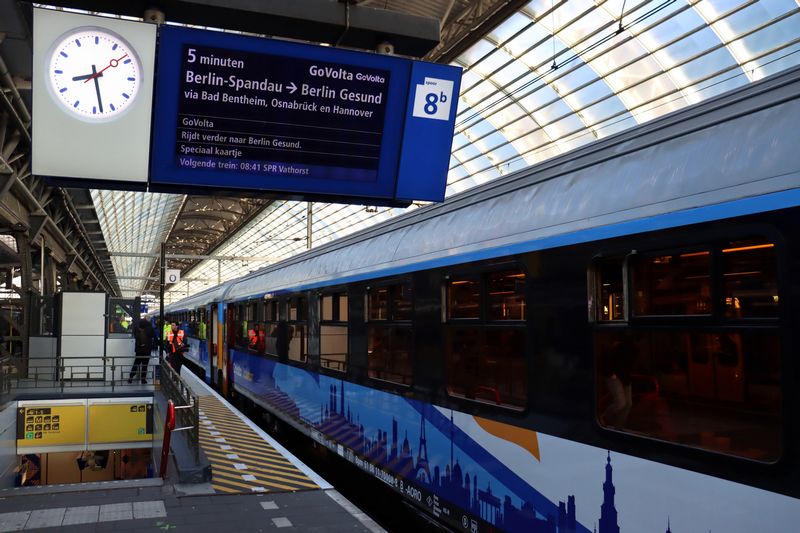 AMSTERDAM - Na jaren van voorbereiding reed op 19 maart 2026 de eerste internationale reizigerstrein van GoVolta. De Train Charter Services 101001 reed de fraai bestickerde trein, bestaande uit twee comfort-rijtuigen en zes economy-rijtuigen, vanuit Amsterdam Centraal naar Bad Bentheim. Deze eerste trein heeft de bestemming Berlijn, waar de trein na een reis van 6 uur en 46 minuten aankwam. Morgen zal de eerste trein naar Hamburg rijden.