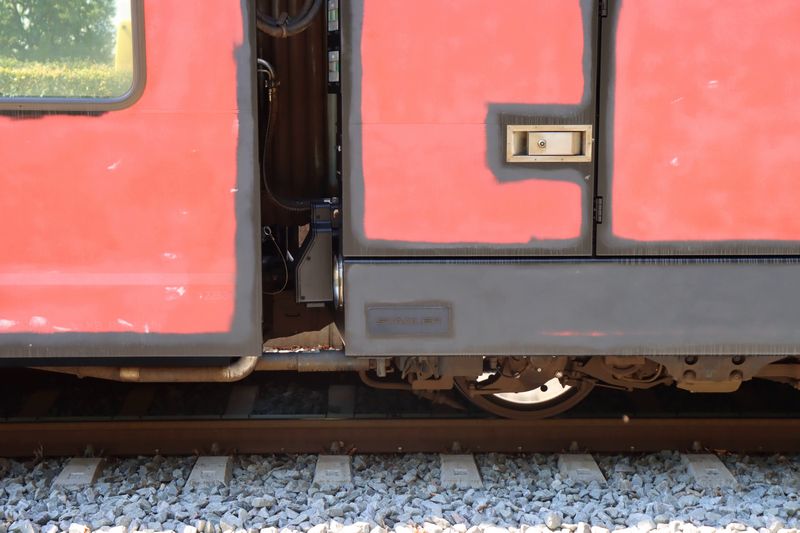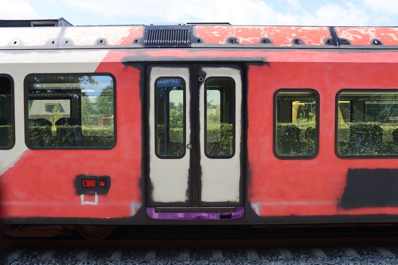 Het omstickeren vond een tijdlang in de treinwerkplaats van Transit-Oost plaats. Tegenwoordig gebeurt dit in Amersfoort. Wij hebben het omstickeren bij Transit-Oost een keer vastgelegd. |
