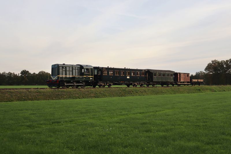 De NS 451 "De Brommer" met een lange reizigerstrein en een goederenwagon t.h.v. de Geukerdijk. Najaarsstoomdagen, 16 oktober 2022. © TreinenInNederland.nl |