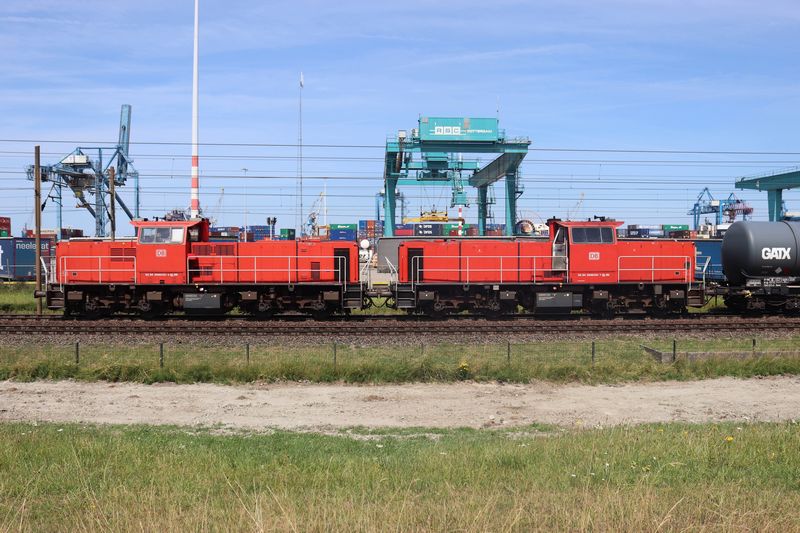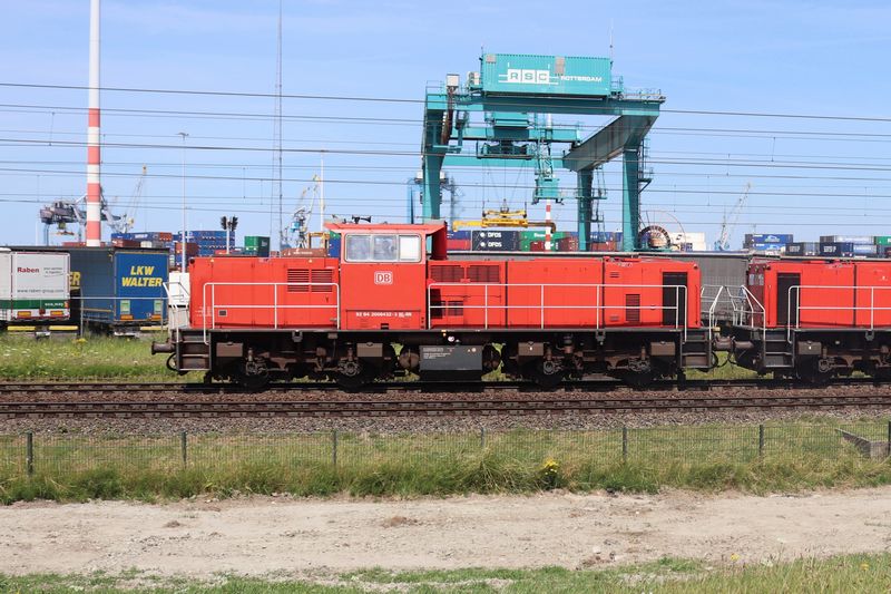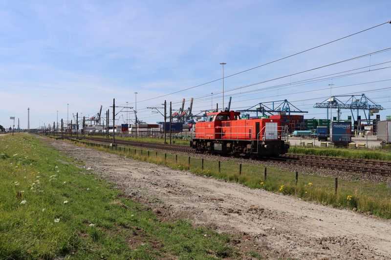 Later op de dag reed de 6432 als losse loc over de Havenspoorlijn langs de RSC-terminal richting de Waalhaven. 12 juli 2025. © TreinenInNederland.nl |