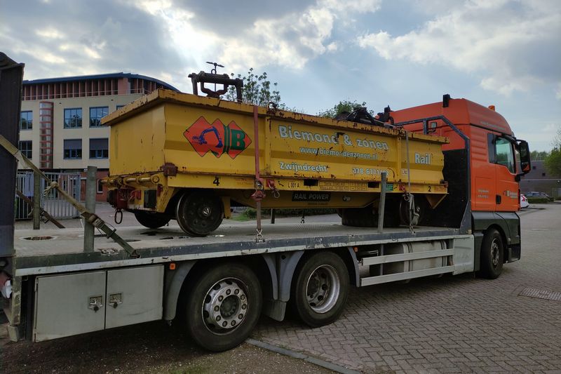 Een vrachtwagen van Biemond & Zonen staat met de bakwagen 1 en een
