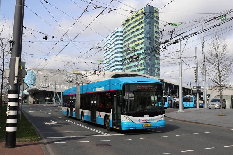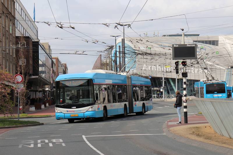 Brengtrolley 5243 rijdt weg vanaf het Centraal Station in Arnhem. 30 maart 2022. © OVnieuws.info |