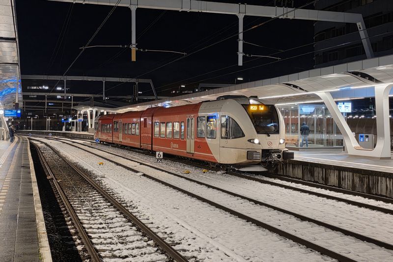 De rode 369 staat in de sneeuw in Arnhem als stoptrein naar Tiel. 4 januari 2026. © TreinenInNederland.nl |