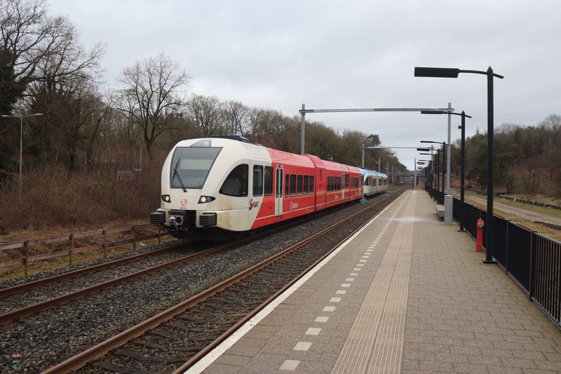 De Arriva 371 rijdt langs de replica van het haltehuisje Groessen richting Winterswijk. 24 februari 2024. © TreinenInNederland.nl |