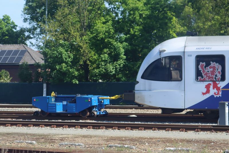 Een rangeerrobot staat met de Arriva 532 staat in Blerick opgesteld. . |