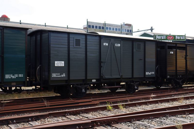 In 1921 bouwde fabrikant Werkspoor in Amsterdam de goederenwagons E108 t/m E153 voor de Nederlandsche Tramweg-Maatschappij (NTM) in Friesland. De NTM was het grootste stoomtrambedrijf in Nederland dat het grootste deel van Friesland en enkele trajecten naar Drenthe, Groningen en Overijssel exploiteerde. De wagons zijn voorzien van stoomverwarmingsleidingen, zodat ze ook dienst zouden kunnen doen als bagagewagens in reizigerstrams. In de jaren '30 ging het vanwege de concurrentie met het wegverkeer erg slecht met de lokaalspoorlijnen en interlokale tramlijnen in Nederland. Na de Eerste Wereldoorlog reden de eerste bussen in Nederland, die fel concurreerden met de trams. Naast bussen waren personenauto's, fietsen en vrachtwagens in opkomst en wonnen ze steeds meer terrein van het spoor. Trambedrijven waren sinds de Eerste Wereldoorlog bezig om stoomlocomotieven te vervangen door goedkopere benzine-, diesel- of elektrische trams om beter te kunnen concurreren. In de jaren '30 stapten veel trambedrijven over op nieuwe bussen of gingen ze failliet. Doordat veel bedrijven het financieel niet meer redde, besloten ze samen te voegen tot grotere bedrijven. In de jaren '30 sloten door heel Nederland veel lokaalspoorlijnen en interlokale tramlijnen. Tijdens en kort na de Tweede Wereldoorlog beleefden de (stoom)trams, door de schaarste aan olie en benzine, een korte opleving. De tramlijnen sloten echter na de oorlog voor het reizigersvervoer. Een deel van de tramlijnen (met een spoorbreedte van 1435 mm 'normaalspoor') werd door de Nederlandsche Spoorwegen overgenomen. De NS reed tot in de jaren '60 en '70 met goederenvervoer over de spoorlijnen. Later werden deze lijnen toch gesloten door de concurrentie met de vrachtwagen of het wegvallen van het vervoer. De Nederlandse Spoorwegen hebben altijd, en doen dat nu nog steeds, vrijwel al hun terzijde gestelde materieel laten slopen waardoor er relatief weinig voor spoorwegmusea bewaard is gebleven. Doordat tijdens de wederopbouw vele rijtuigen en goederenwagons buiten de spoorwegen een tweede leven hebben gevonden, zijn tientallen van deze rijtuigen en goederenwagons bewaard gebleven. Spoorwegmusea hebben deze treinen teruggevonden en hebben ze kunnen restaureren zoals ze vroeger bij de spoorwegen dienst hebben gedaan. Hierdoor zijn er bijzondere rijtuigen en goederenwagons bewaard gebleven die anders waren gesloopt. Vele van deze bewaarde treinen hebben later vanwege hun historische waarde de hoogste A-status toegekend gekregen binnen het Nationaal Register Railerfgoed. De rijtuigen NS BC423, NS BC425, NS BC455, NS C1040, NS C1137, NS B1605, NS C7032, NTM C205, SBM AB24 en Z.V.T.M. AB8 werden na de oorlog als woningen gebruikt en zijn hierdoor bewaard gebleven. Het rijtuig RTM AB334 heeft ook als woning gediend, maar werd daarvoor eerst nog als douanekantoor gebruikt. Het rijtuig ZE AB6 en een eerste klas rijtuig van de ZNSM werden als tuinhuisjes gebruikt. De goederenwagons EDS 85, N.H.T.M. 21, NTM E67, NTM E128, NTM E134, NTM F63, O.G. E102, NS 1524, USATC 224340, USATC 220410 en NS-rijtuig AB7216 werden als schuren of opslagruimtes gebruikt en zijn daardoor niet gesloopt. De goederenwagons NS CHD 8681 en NTM conducteurswagen P1 werden als stal voor dieren gebruikt. De NTM post-bagagewagen D6 heeft een tweede leven gekregen als kantoor. De rijtuigen NS B1813 en NS C1820 werden respectievelijk als eet- en verblijfsruimte en als slaapzaal gebruikt bij een vakantieverblijf. Het rijtuig NS C6478 werd op een kinderspeelplaats neergezet en is hiermee bewaard gebleven. De NTM beëindigde in 1947 en 1948 het reizigersvervoer op haar tramlijnen. Een groot deel van de rijtuigen werd overgenomen door de Nederlandsche Spoorwegen en elders in Nederland ingezet. Nadat de NTM het reizigersvervoer op de tramlijnen beëindigde, nam NS in 1948 de exploitatie van het goederenvervoer over. Hiervoor nam NS een deel van de locomotieven en goederenwagons van de NTM over. Het materieel dat NS niet overnam, werd in 1947 en 1948 door de NTM terzijde gesteld. In 1949 nam de NTM de overgebleven spoorlijnen weer over van de NS; het materieel bleef echter wel eigendom van de NS. In 1948 stelde de NTM de E128 buitendienst. Dat jaar werd de wagon verkocht aan Morra in Friesland. Hier heeft de wagon tot 1995 gediend voor de opslag van veevoer. In 1981 is de wagon de eerste keer geschonken aan de Museumstoomtram Hoorn - Medemblik. De SHM heeft de wagon echter nooit opgehaald. Veertien jaar later, in 1995, is de wagon nogmaals geschonken aan de Museumstoomtram. Ditmaal werd de wagon wel opgehaald en naar de opslag bij Corus in Beverwijk gebracht. In 2001 en 2002 is de wagon gerestaureerd en weer in dienst gesteld als de NTM E128 bij de SHM. Naast de E128 heeft de SHM ook goederenwagon E134 van hetzelfde type is haar collectie. De NTM E128 heeft vanwege haar cultuurhistorische waarde de C-status toegekend gekregen binnen het Nationaal Register Railerfgoed. |
