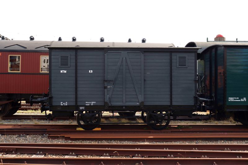 In 1916 werd de K9 gebouwd door Werkspoor en in dienst genomen bij de Nederlandsche Tramweg-Maatschappij (NTM) in Friesland. De NTM was het grootste stoomtrambedrijf in Nederland dat het grootste deel van Friesland en enkele trajecten naar Drenthe, Groningen en Overijssel exploiteerde. De K9 is een koppelwagen die naast goederen vervoeren ook geschikt is om met zowel trammaterieel als spoorwegmaterieel te koppelen. Beide hebben verschillende buffers en trekwerk van elkaar. Op deze manier konden wagons vanaf het hoofdspoor meerijden in de trams op de lijnen in Friesland en omgeving. De K9 heeft aan de uiteinden van de wagon een verhoogde vloer, waardoor de buffers en het trekwerk voor spoorwegmaterieel geplaatst konden worden. Verder is de K9 gelijk aan de normale goederenwagons uit de serie E98 t/m E107. Door middel van de koppelwagens konden ook locomotieven zonder tramstoot- en trekwerk de tramwagons van de NTM trekken. De vijf ex-War Department-locomotieven die later werden onderverdeeld in de NS-serie 160 (waarvan de 162 bewaard is en de 164 gereconstrueerd is) maakten gebruik van de NTM-koppelwagons. In de jaren '30 ging het vanwege de concurrentie met het wegverkeer erg slecht met de lokaalspoorlijnen en interlokale tramlijnen in Nederland. Na de Eerste Wereldoorlog reden de eerste bussen in Nederland, die fel concurreerden met de trams. Naast bussen waren personenauto's, fietsen en vrachtwagens in opkomst en wonnen ze steeds meer terrein van het spoor. Trambedrijven waren sinds de Eerste Wereldoorlog bezig om stoomlocomotieven te vervangen door goedkopere benzine-, diesel- of elektrische trams om beter te kunnen concurreren. In de jaren '30 stapten veel trambedrijven over op nieuwe bussen of gingen ze failliet. Doordat veel bedrijven het financieel niet meer redde, besloten ze samen te voegen tot grotere bedrijven. In de jaren '30 sloten door heel Nederland veel lokaalspoorlijnen en interlokale tramlijnen. Tijdens en kort na de Tweede Wereldoorlog beleefden de (stoom)trams, door de schaarste aan olie en benzine, een korte opleving. De tramlijnen sloten echter na de oorlog voor het reizigersvervoer. Een deel van de tramlijnen (met een spoorbreedte van 1435 mm 'normaalspoor') werd door de Nederlandsche Spoorwegen overgenomen. De NS reed tot in de jaren '60 en '70 met goederenvervoer over de spoorlijnen. Later werden deze lijnen toch gesloten door de concurrentie met de vrachtwagen of het wegvallen van het vervoer. De NTM beëindigde in 1947 en 1948 het reizigersvervoer op haar tramlijnen. Een groot deel van de rijtuigen werd overgenomen door de Nederlandsche Spoorwegen en elders in Nederland ingezet. Nadat de NTM het reizigersvervoer op de tramlijnen beëindigde, nam NS in 1948 de exploitatie van het goederenvervoer over. Hiervoor nam NS een deel van de locomotieven en goederenwagons van de NTM over. Het materieel dat NS niet overnam, werd in 1947 en 1948 door de NTM terzijde gesteld. In 1949 nam de NTM de overgebleven spoorlijnen weer over van de NS; het materieel bleef echter wel eigendom van de NS. De K9 werd, samen met twee andere wagons, door de Nederlandsche Spoorwegen overgenomen voor baanonderhoud. In 1963 werd de K9 door NS buitendienst gesteld en overgedragen aan het Spoorwegmuseum. In 2003 gaf het Spoorwegmuseum de koppelwagon in bruikleen aan de Museumstoomtram Hoorn - Medemblik. In 2003 en 2004 heeft de SHM de wagon gerestaureerd en weer in dienst gesteld. In Hoorn heeft de K9, samen met de NTM K16 uit 1924, nog steeds de functie van koppelwagen. De collectie van de SHM bestaat namelijk uit trammaterieel en spoorwegmaterieel. De NTM koppelwagen K9 heeft vanwege haar cultuurhistorische waarde de hoogste A-status toegekend gekregen binnen het Nationaal Register Railerfgoed. De K9 is de oudste bewaarde koppelwagon in Nederland. |