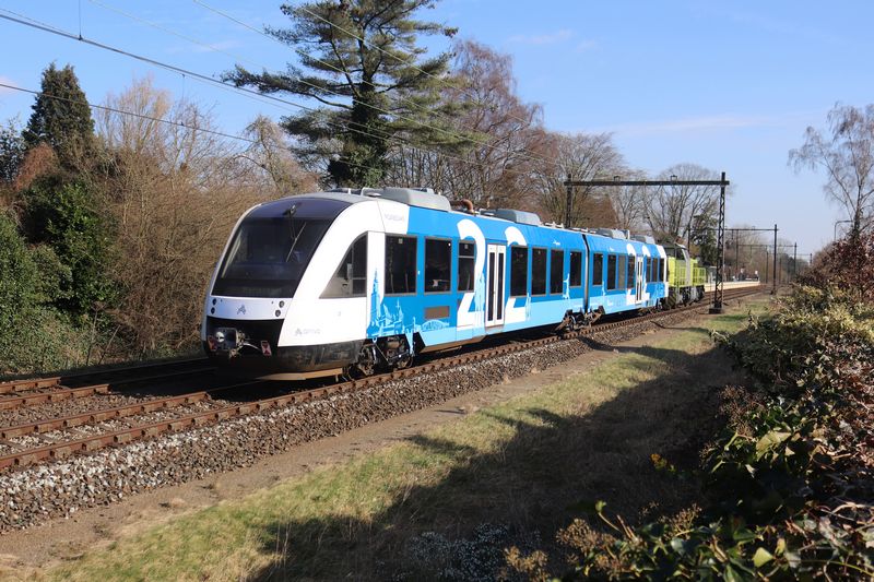 De ÖBB Rail Cargo Group 1375 rijdt met de Arriva Lint 28 door Rheden naar Zutphen. 27 februari 2026. © TreinenInNederland.nl |