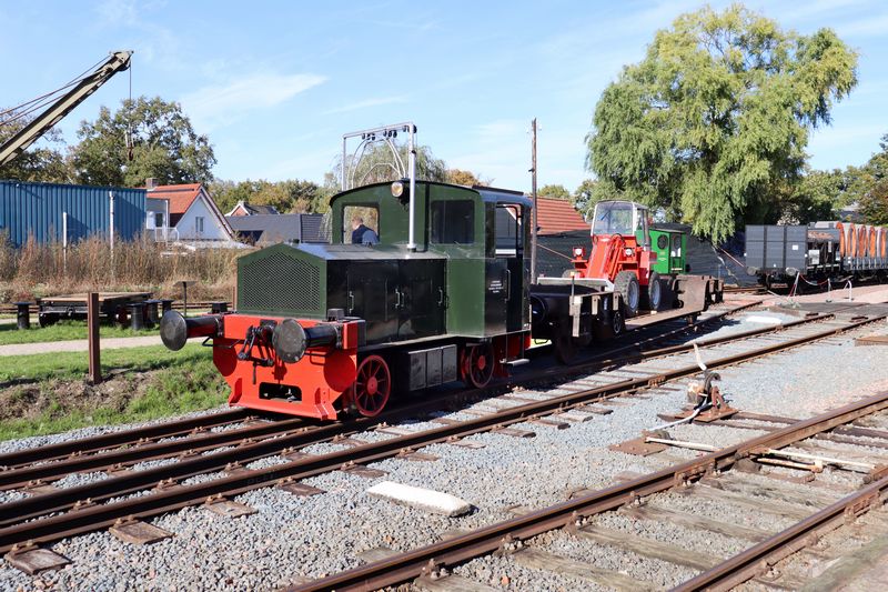 De MBS 10 rangeert met een platte wagen met een shovel in Boekelo. Najaarsstoomdagen 2025, 18 oktober 2025. © TreinenInNederland.nl |