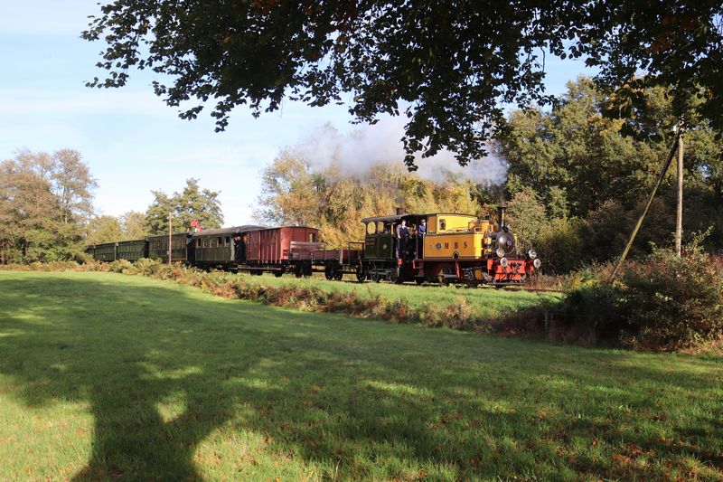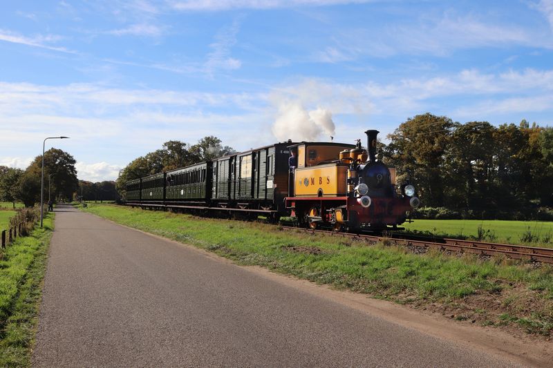 De MBS 6 met twee rijtuigen en een goederenwagon vlak voor het viaduct over de N-18. Najaarsstoomdagen, 16 oktober 2022. © TreinenInNederland.nl |