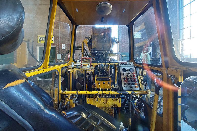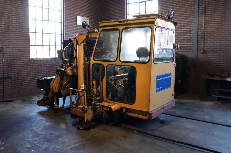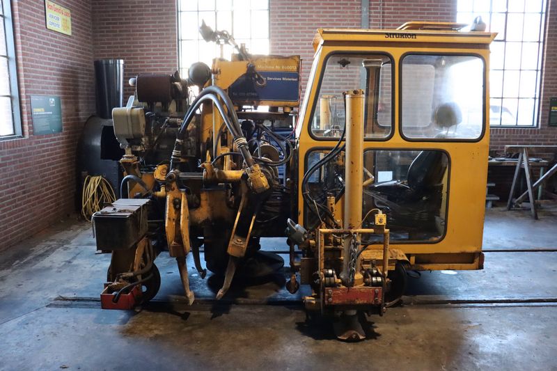 Achterin de werkplaats in Haaksbergen staat een kleine ex-NS / Strukton stopmachine. Najaarsstoomdagen 2025, 18 oktober 2025. © TreinenInNederland.nl |