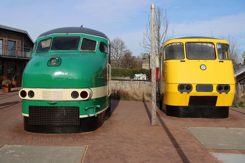 Een cabine van de Mat'64 951 en een SGM staan op het buitenterrein van het Spoorwegmuseum. 15 februari 2026. © TreinenInNederland.nl |