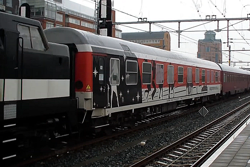 De Railexperts 9902 komt met de Alpen Express vanuit Venlo Amsterdam Centraal binnen gereden. Op de foto is een Bcmh-rijtuig te zien met het UIC-nummer 51 56 05-70 506-7. 5 maart 2023. © TreinenInNederland.nl |