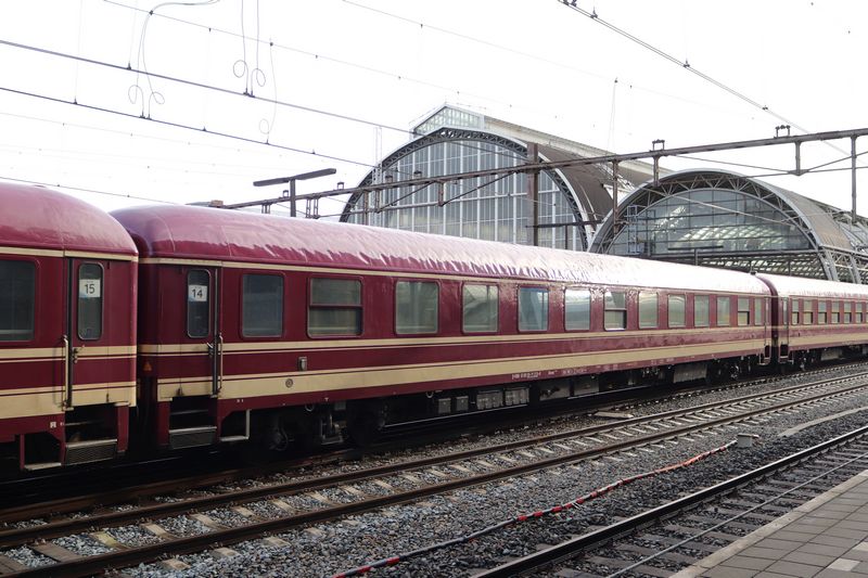 Een Bvcmz-rijtuig met UIC-nummer 61 80 50-71 231-3 van Euro Express rijdt mee in de European Sleeper Praag - Brussel. De foto toont het rijtuig in Amsterdam Centraal. 16 april 2025. © TreinenInNederland.nl |