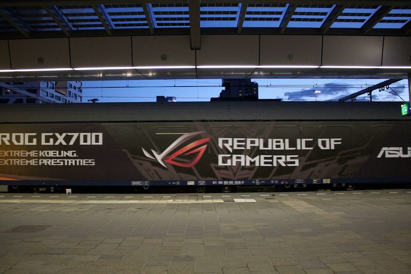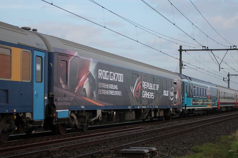 De door Railpromo gehuurde NMBS 2825 rijdt met een sleep bestickerde rijtuigen door Schalkwijk richting Venlo en verder naar Köln Messe-Deutz voor het evenement Gamescom. Op de foto is een bestickerd NMBS-rijtuig te zien van de serie I10 met het UIC-nummer 61 88 88-90 007-2. 20 augustus 2016. © TreinenInNederland.nl |