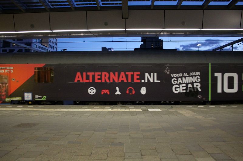 In de avond stond de trein in Utrecht Centraal te wachten. Op de foto is de zijkant van een (voormoedelijk) I10-rijtuig te zien. |