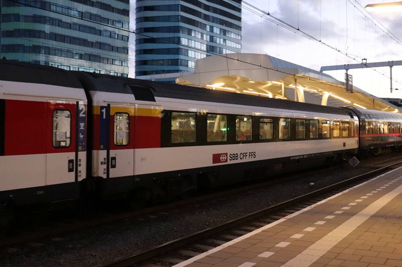 Een SBB-rijtuig van het type Apm met UIC-nummer 61 85 10-90 227-2 staat als NightJet uit Zürich te Amsterdam Centraal. 3 april 2025. © TreinenInNederland.nl |