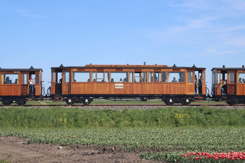 De SHM 30 rijdt met acht rijtuigen tussen Wognum-Nibbixwoud en Twisk ter hoogte van de Broerdijk als tulpentram. |