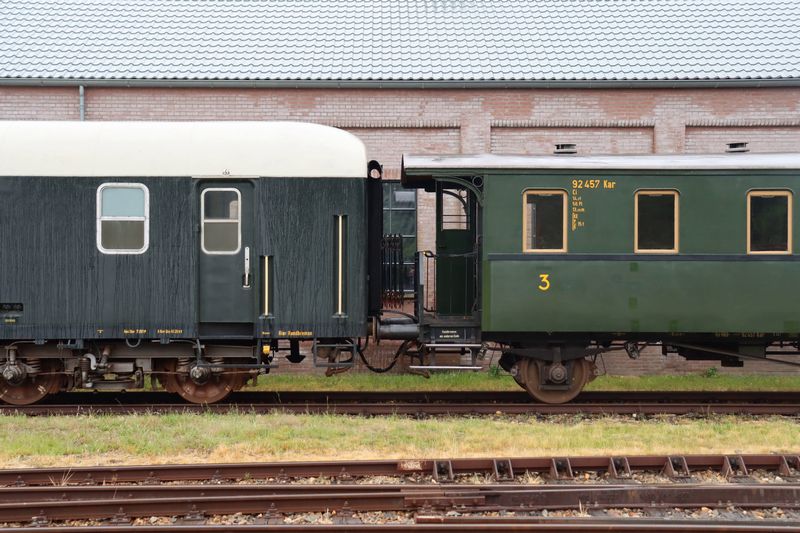 De 52 8082 rangeert in Stadskanaal met rijtuig 92 457. Nationale Stoomtreindag