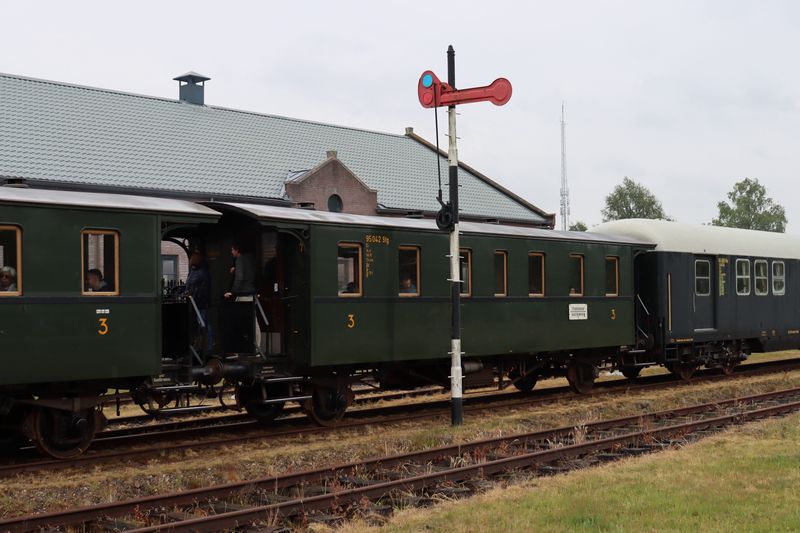 De 52 8060 rijdt met een reizigerstrein Stadskanaal binnen. Op de foto is rijtuig 95 042 van de STAR te zien. Nationale Stoomtreindag 2025 bij de Museumspoorlijn STAR, 29 mei 2025. © TreinenInNederland.nl |