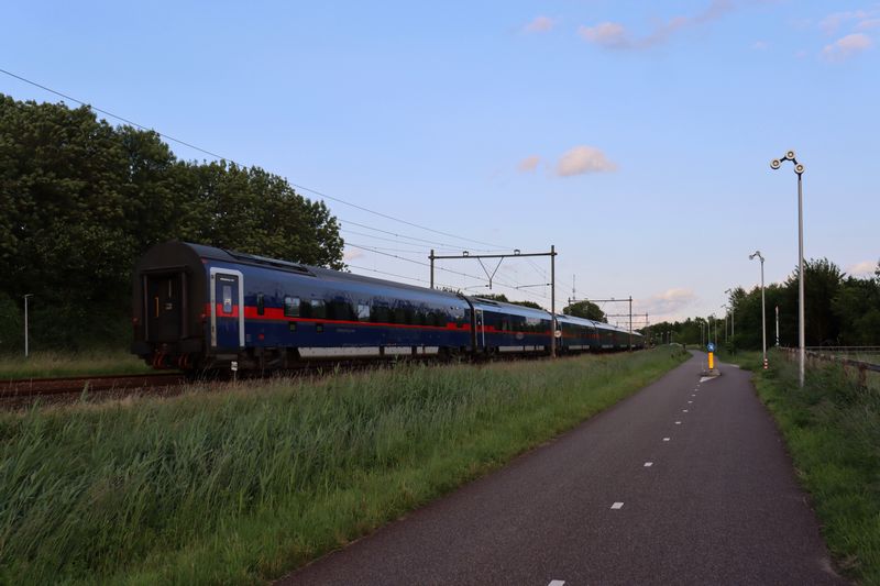 De NSI 6193 932 rijdt met een omgeleide NightJet naar NightJet uit Innsbruck en Wenen door Zevenaar richting Duitsland. 8 juni 2025. © TreinenInNederland.nl |