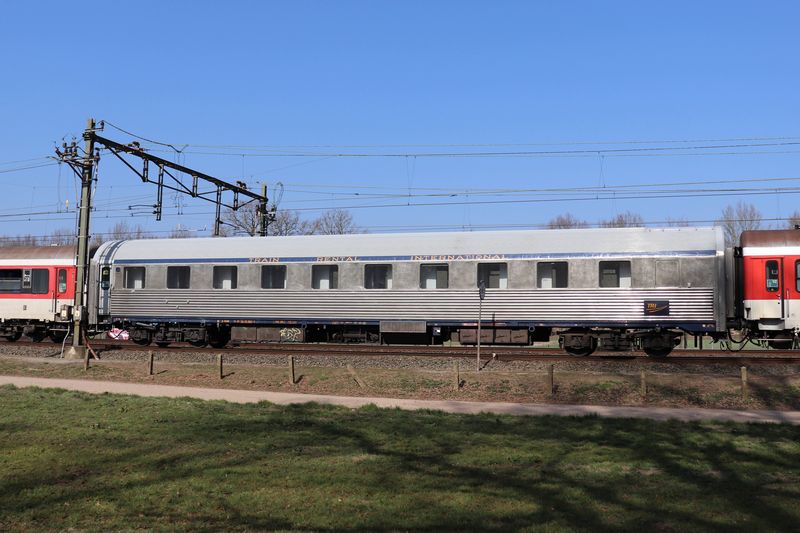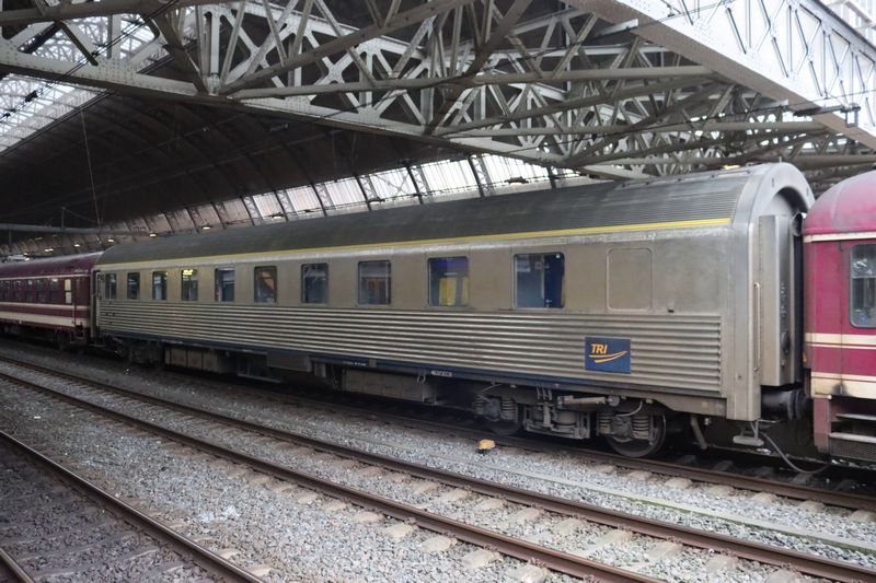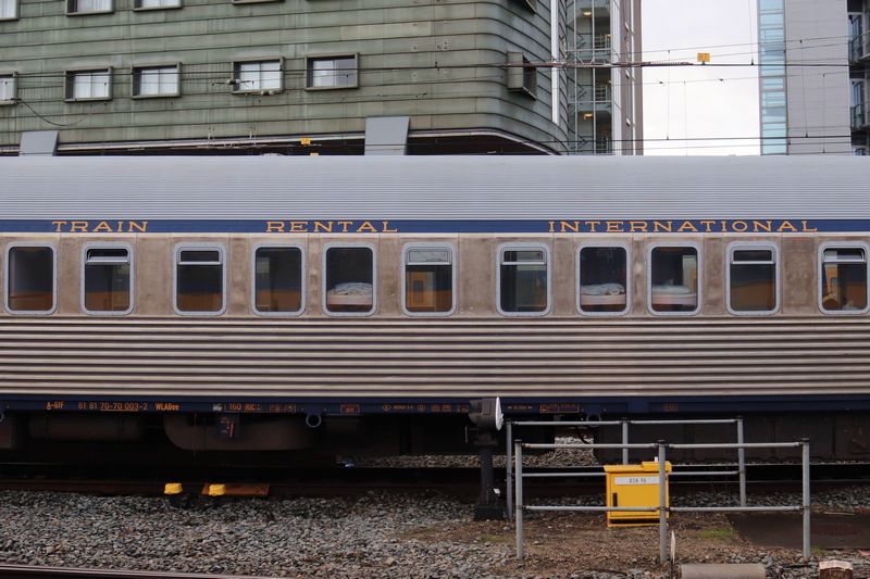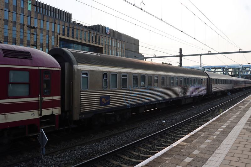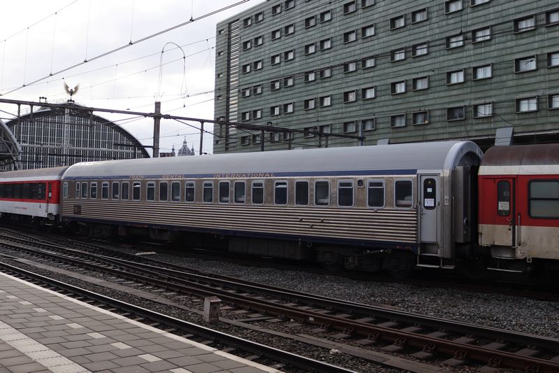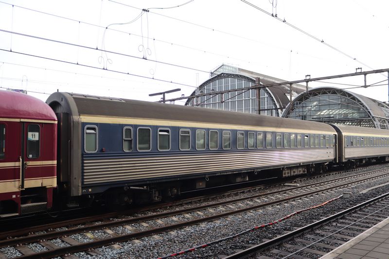 Een WLABee-rijtuig met UIC-nummer 61 81 70-70 004-0 van Gesellschaft für Fahrzeugtechnik rijdt mee in de European Sleeper Praag - Brussel. De foto toont het uit de jaren '50 stammende rijtuig in Amsterdam Centraal. 16 april 2025. © TreinenInNederland.nl |