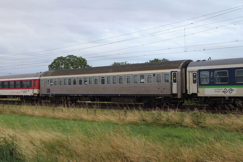 De Lineas 186 457 rijdt met een omgeleide European Sleeper door Duiven richting Arnhem, Utrecht, Rotterdam en verder naar België. Op de foto is een WLABee-rijtuig te zien met het UIC-nummer 61 81 70-70 004-0. 10 juli 2023. © TreinenInNederland.nl |